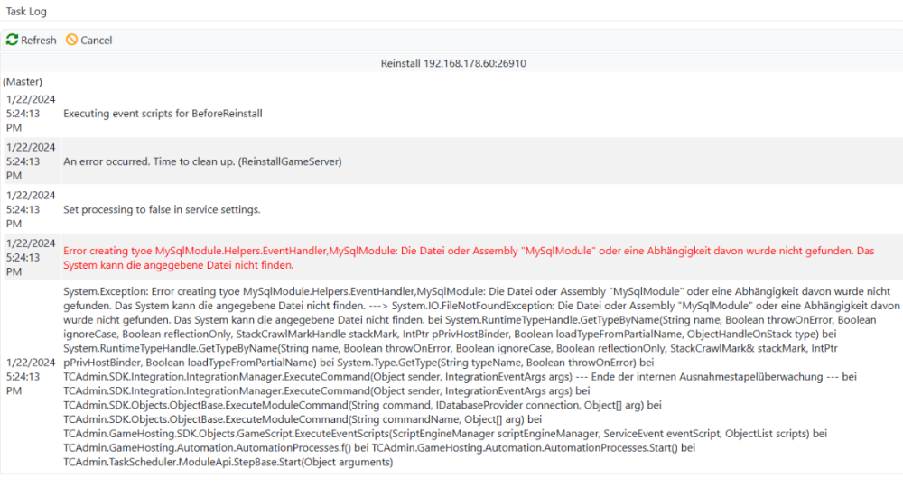 Hello, I get a MySQL error when uninstalling or reinstalling. Installing works and Detach and then manually deleting the files also works. I have already reinstalled MySQL. The MySQL server runs together with the panel on the master. Error: Error creating tyoe MySqlModule.Helpers.EventHandler,MySqlModule: Die Datei oder Assembly "MySqlModule" oder eine Abhängigkeit davon wurde nicht gefunden. Das System kann die angegebene Datei nicht finden. MySQL: Server 8.2 TaskLog: TCAdmin Version 2.0.188.0 Version upgrade does not work either, probably because of the error.
