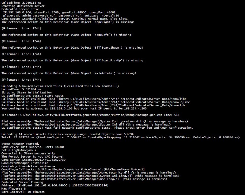 @Numpty I have altered your script. Only thing I could see was -slot1 was missing from commandline. I also adjusted the web console to output to console so you can see exactly what is running as server starts up. I have removed some of the commandlines that are just not needed. Steam update changed to anonymous. Server runs and can be seen in game list. I have attached your updated one and mine (it has configuration editor added). See how you go. (you need to change the ports back to 27015 and 27016 as I use different ones and forgot when uploading) TheForestNumpty - Windows.xml theforest - Windows.xml