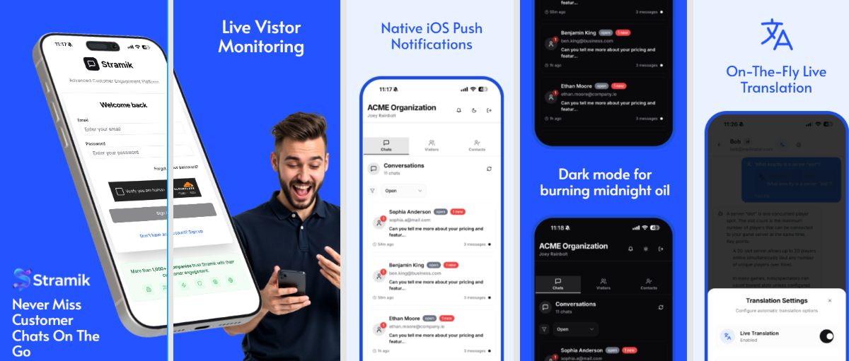 Exciting iOS App Update: We’re excited to announce that our new iOS app, is now live on the Apple App Store! (https://apps.apple.com/us/app/stramik/id6748674977) The Stramik app was built to help support teams stay connected with their customers wherever they are. From your phone or tablet, you can monitor live website visitors, start chats instantly, and manage customer contacts all in one clean, mobile-friendly interface. We’ve also added push notifications to make sure you never miss a message or engagement opportunity, and live translation on the fly, allowing you to communicate seamlessly with visitors around the world in their preferred language.