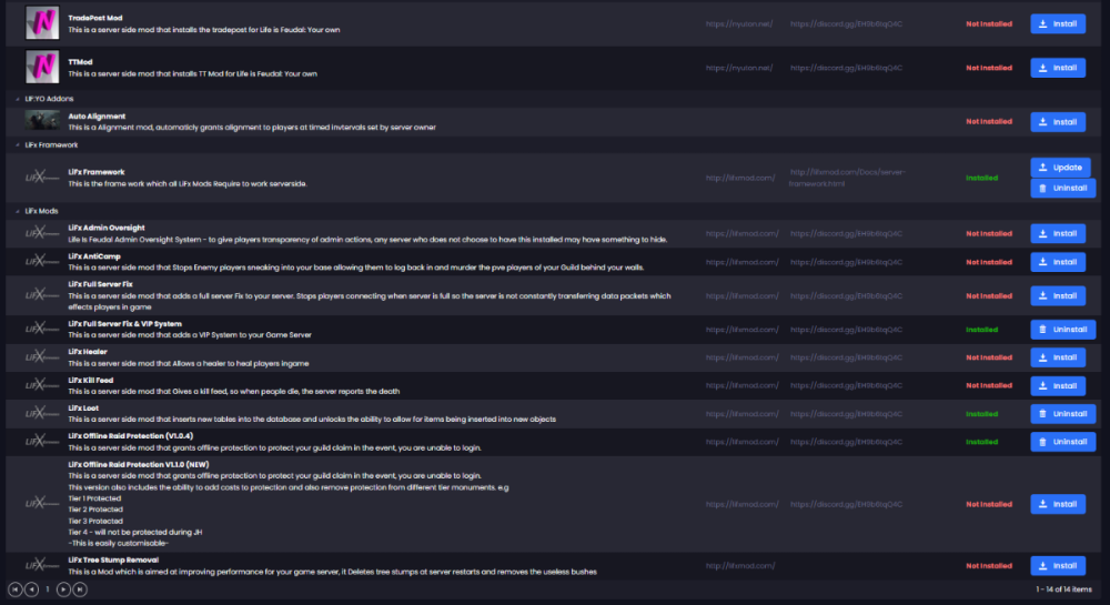 This is a version i am using, its heavily modified version of unknown original origin. This creates databases for each server and auto creates usernames and passwords for client databases. - It also has alot of server side only mods created by the Lifx Modding Community. - Tradepost auto installer (automaticly rewrites required to edit files uponinstallation and uninstall) - TTmod auto installer (automaticly rewrites required to edit files uponinstallation and uninstall) Installation Requirements. 1) Search for the line mysql_password="YourPassword"; 2) replace "YourPassword" with your db root password (I use only a local db account for this to avoid potential issues) - Their is 4 places for this so use replace all to make life easier ( I use Visual Studio) - Ctrl + H will help with this 3) Search for the line mysql_root="root"; 4) replace "root" with your db root user account name (I use only a local db account for this to avoid potential issues) - Their is 4 places for this so use replace all to make life easier ( I use Visual Studio) - Ctrl + H will help with this. 5) Upload as normal. Below is an example of the Mods section Life is Feudal - Windows.xml