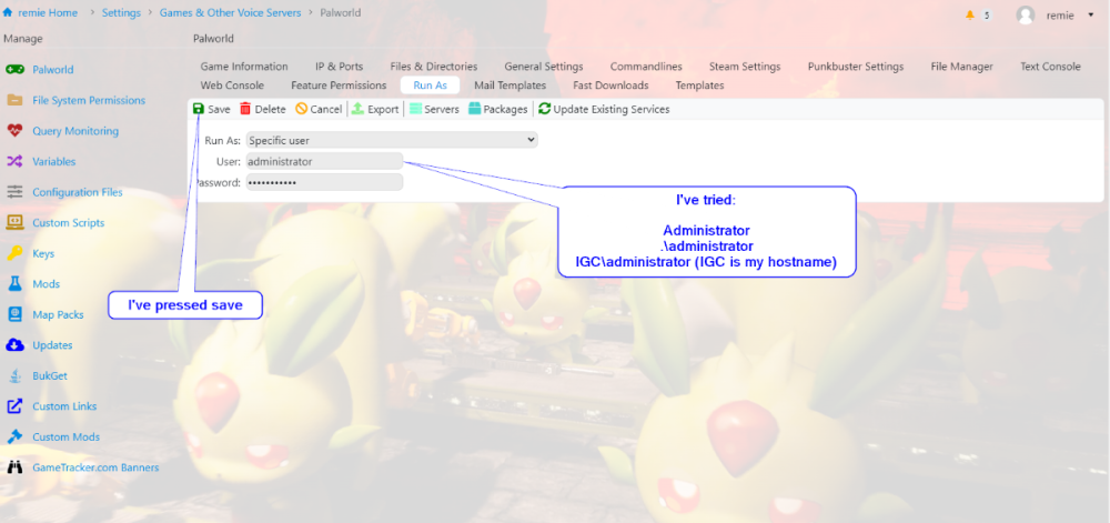 3. Hi, Because of a bug in palword dedicated server whenever you change the running user the player GUID will get messed up. I'm moving the server from application to TCadmin. Therefore the server will be run as TCAgame, I don't want this because this messes up the GUID of my players which are forced to start over again. Whenever I change the credentials in the game service config it won't save and will default back to TCAgame. How can I change the gameconfig to run under "administrator"? After I press save it defaults back to TCAgame